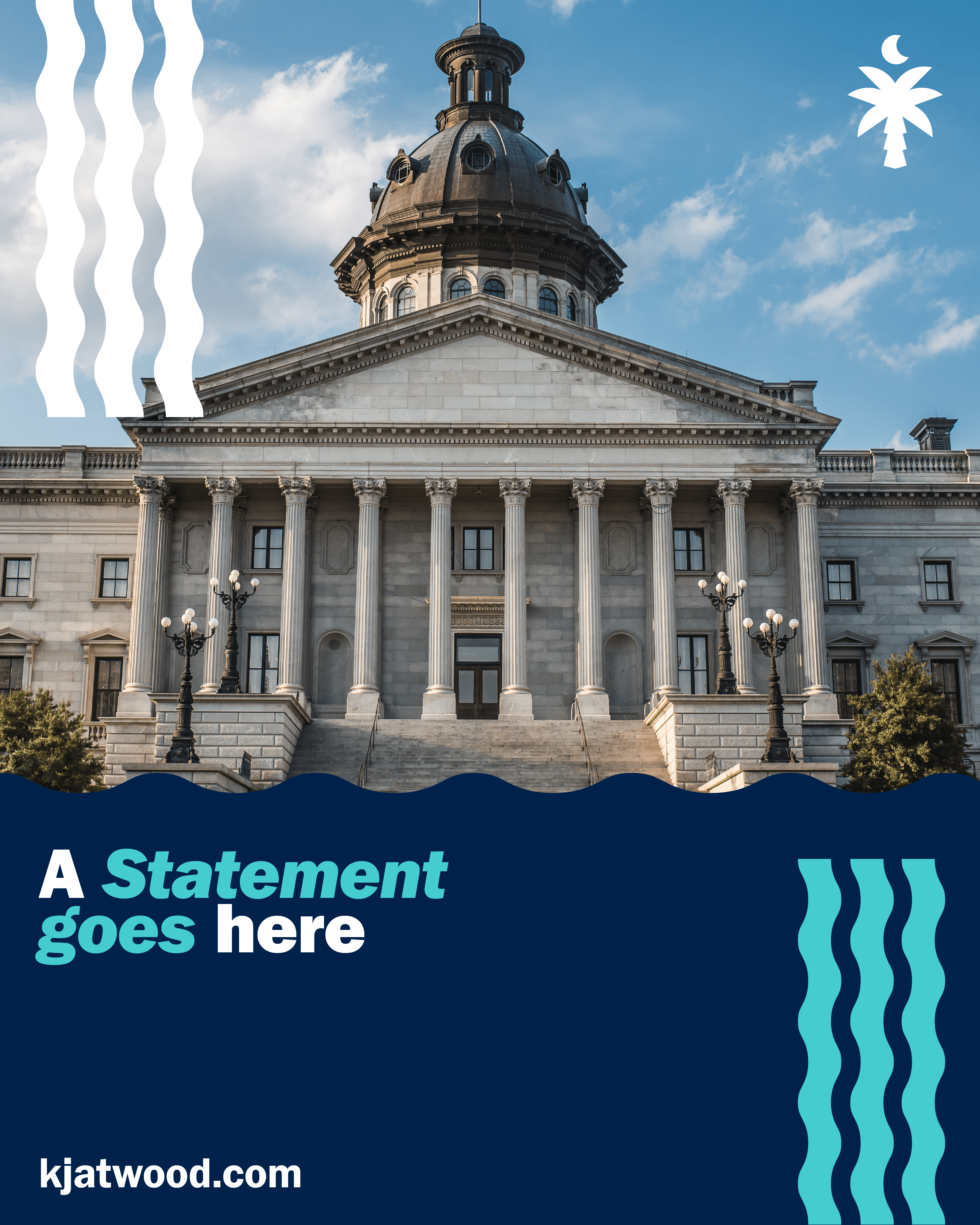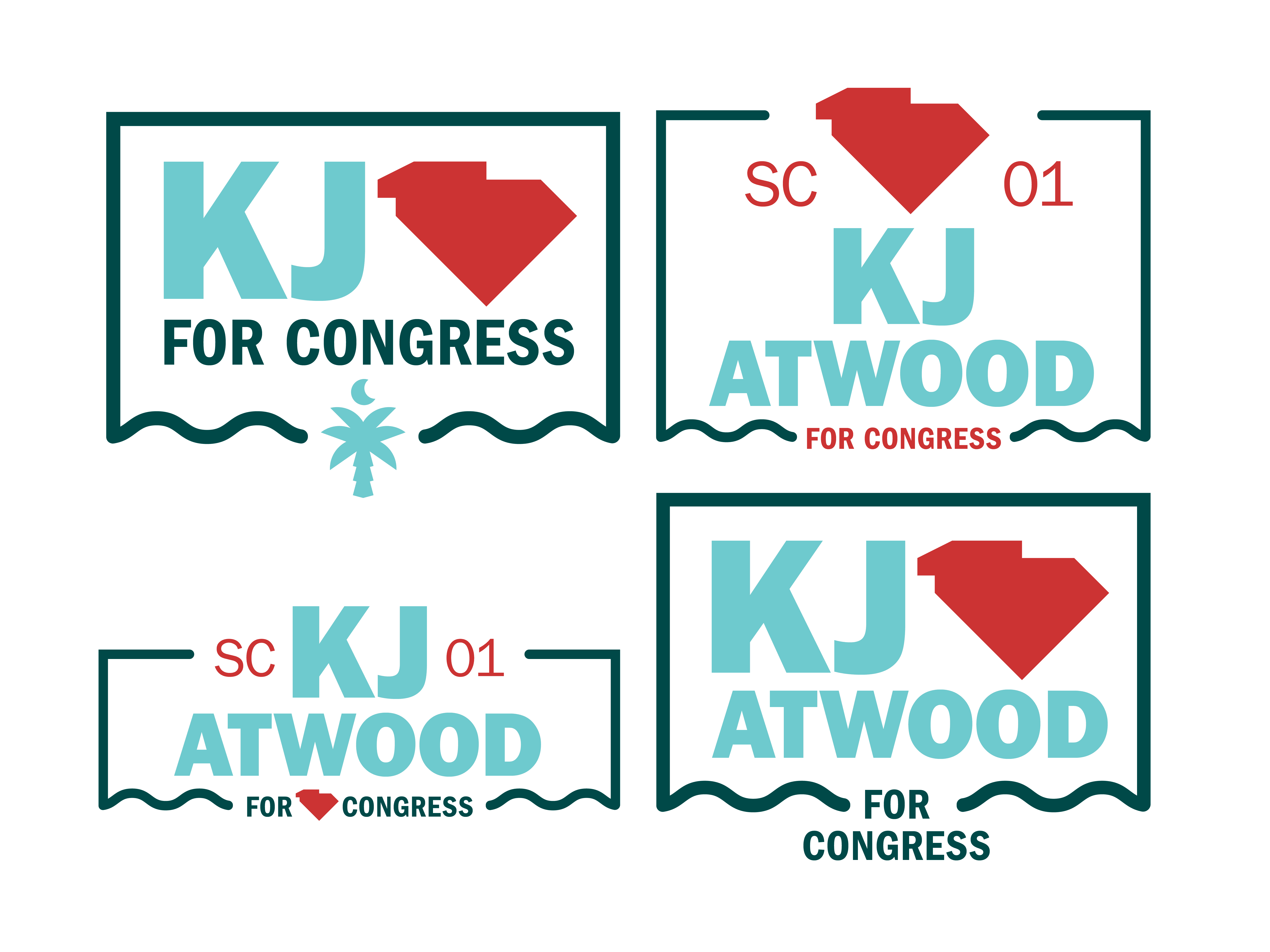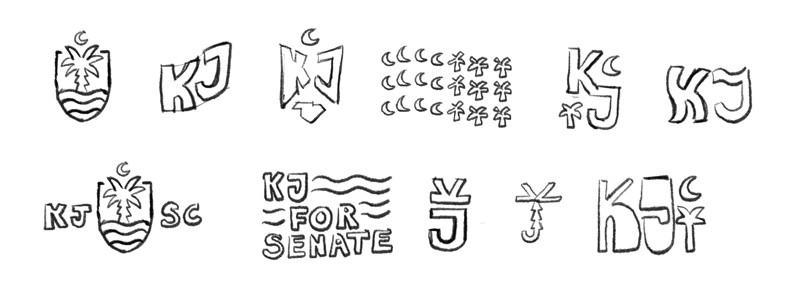 Early in the process, the client expressed interest in a more traditional campaign logo variation, reflecting the common format of a candidate’s name enclosed within a rectangular frame, accompanied by the subline “Running for ______.” In response, a version of this format was developed, incorporating curved wave elements to reinforce South Carolina’s coastal identity. Additional logo variations were also created for use across different contexts, all integrating the palm tree and crescent moon as the main symbols.